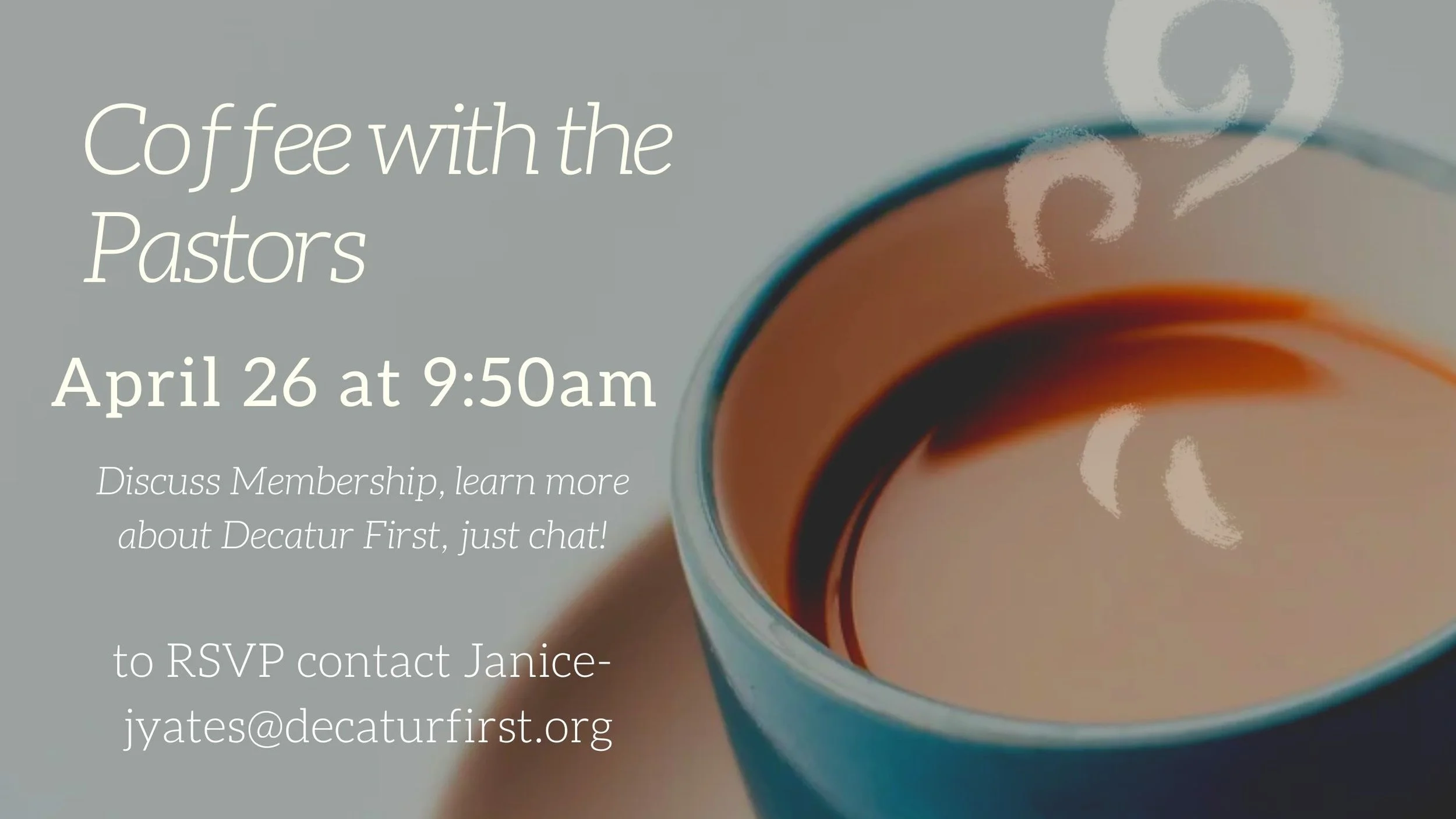 If you are curious about membership or just ready to get more connected, you are invited to Coffee with the Pastors on April 26. The next Joining Sunday is May 3. Email Janice at jyates@decaturfirst.org for more info or to RSVP.