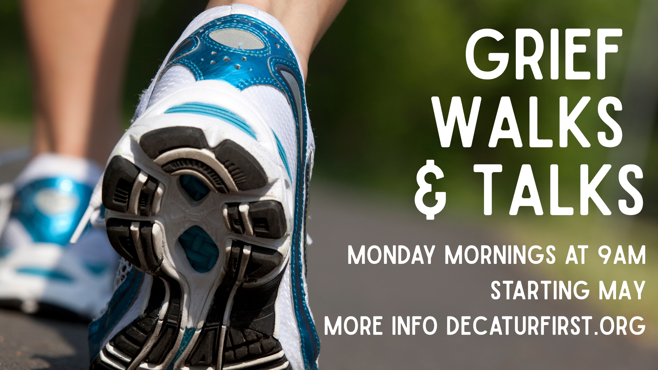 Join Rev. Blair Setnor and Scott Tewell Monday mornings at 9am starting May 4th. Like the Wednesday walking group, we'll walk for an hour and then eat together. If you don't want to walk, you are welcome to join for the post-walk meal! We will have grief related prompts to discuss as we support one another. To learn more, email Rev. Blair, bsetnor@decaturfirst.org.